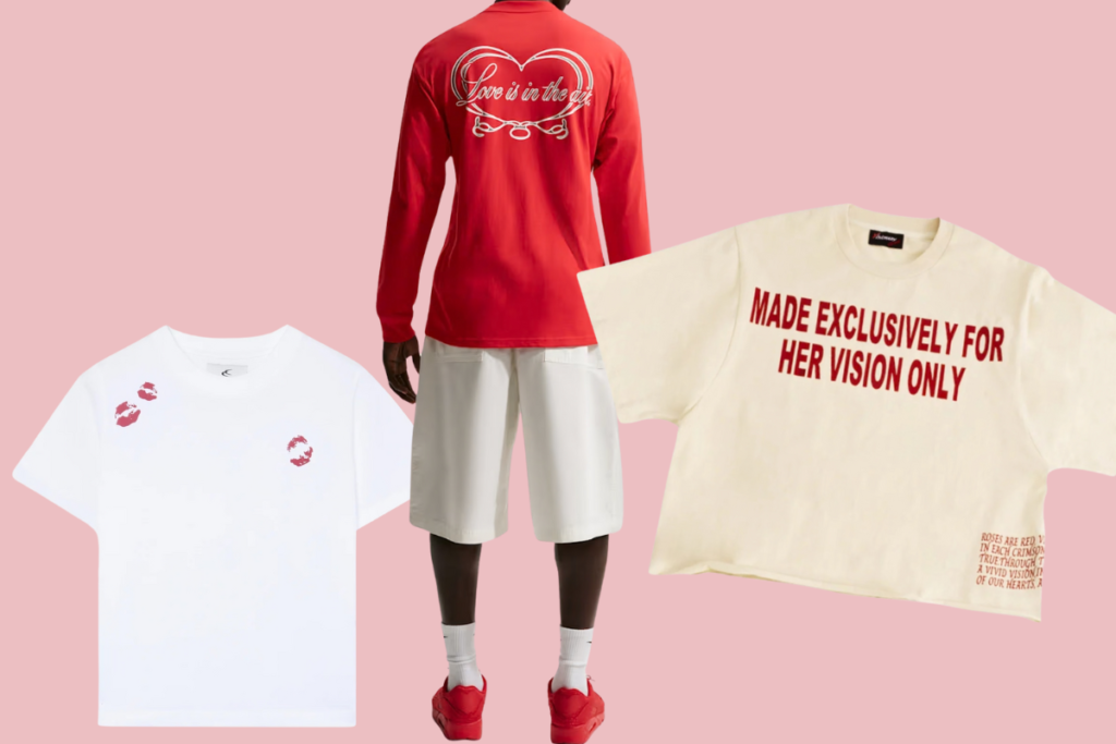 A great tee is hard to beat. I love that these options give totally different fits while still feeling very Valentine’s Day coded. The KISS ME tee from Scuffers is a little cheeky with a tighter fit, while Made for Her Vision Only brings boxy, oversized but still cropped energy that feels current and cool. The Nike long sleeve is more classic and perfect for gym lovers or anyone who just wants a solid, comfy staple for everyday wear.