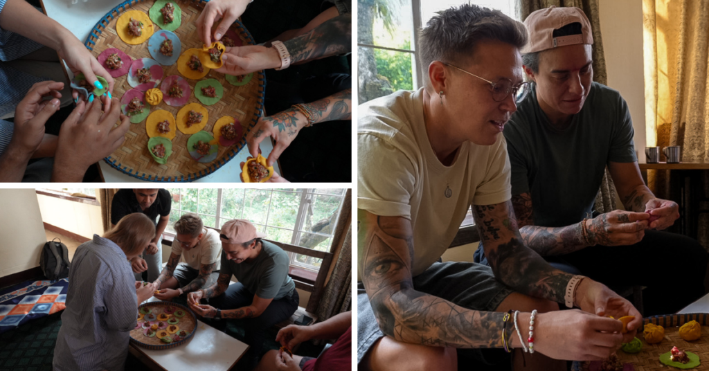 Our first group experience was Queermandu’s Homo Momo class, rainbow-color dumplings, natural dyes, a tiny kitchen in Thamel, and a whole lot of queer storytelling. It was the perfect low-stakes way to meet each other without the pressure of, “Hi, we’re climbing a mountain together tomorrow.”